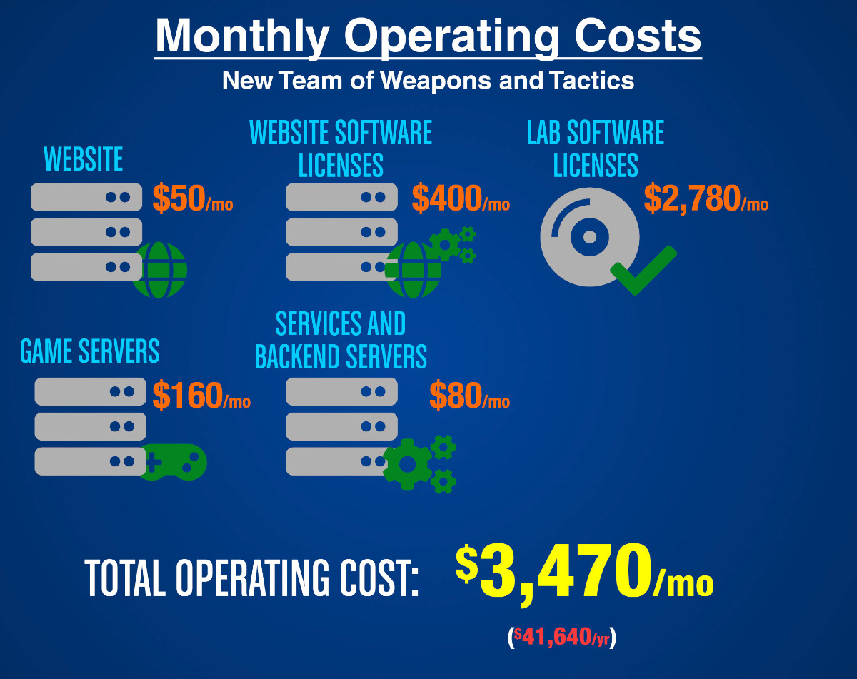 As of 2020, our operational costs are fairly steady. In the spirit of transparency, the New Team of Weapons and Tactics has decided to openly disclose our routine operating costs. In doing so, we hope to be able to provide some insight on the expenses that our founders incur in order to keep the community completely operational. All of the resources that we use are completely and genuinely licensed to us for use, and all applicable resources are paid for by our founders and by any donations that we receive. Pirated or "nulled" resources or software is completely illegal and is strictly prohibited here.